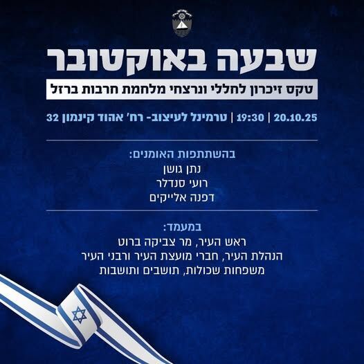 בת-ים זוכרת: טקס הזיכרון המרכזי לאירועי ה-7 באוקטובר יתקיים ב-20.10.25 בהשתתפות נתן גושן ורועי סנדלר בטרמינל לעיצוב