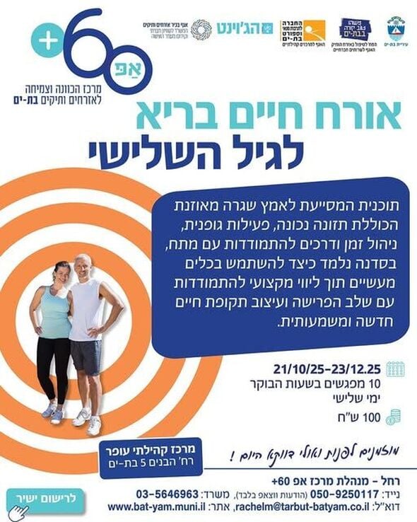 בימי שלישי החל מ21.10 תיפתח במרכז עופר קהילתי עופר בת ים סדנת אורח חיים בריא לבני הגיל השלישי בעיר