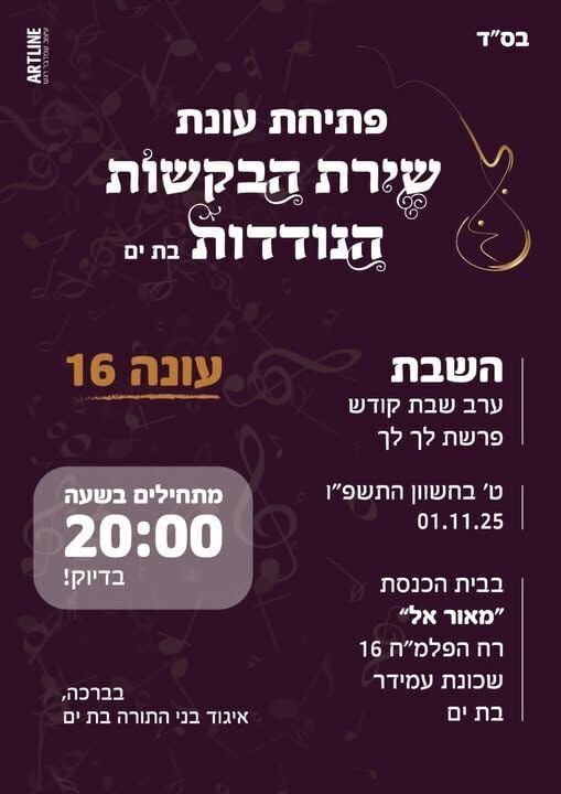 פתיחת עונת שירת הבקשות הנודדות ה-16 בבת ים: האירוע יתקיים במוצאי שבת פרשת לך לך, 1.11.2022, בבית הכנסת 'מאור אל'