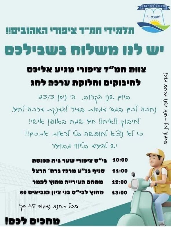 לקראת חג הפסח, צוות בית חינוך חמ"ד ציפורי בבת ים יצא ביוזמה חגיגית ומרגשת למען התלמידים. בבית הספר החליטו כי לא יצאו לחופשת החג מבלי לפגוש את הילדים באופן אישי, וארגנו סיור לחלוקת ערכות חג.
