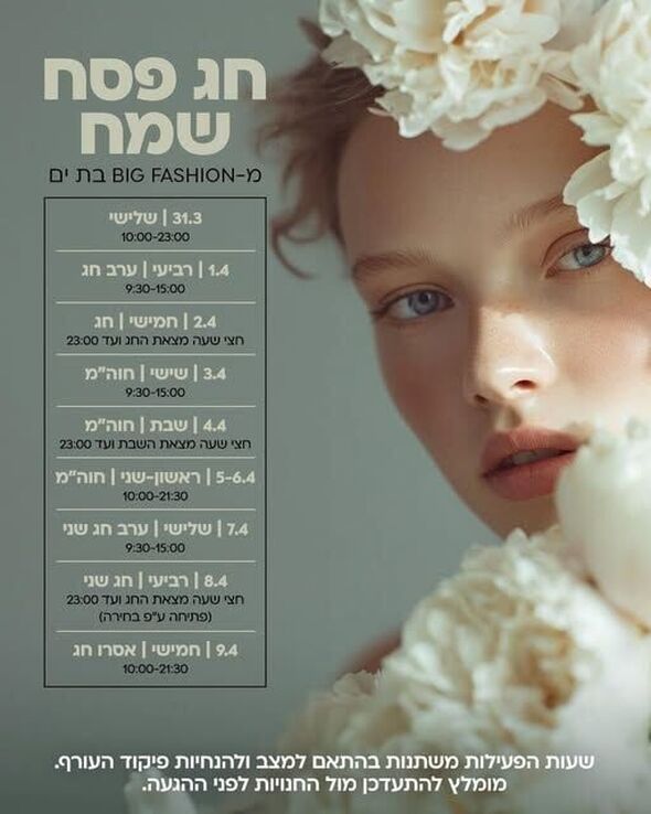 מתחם ביג פאשן (BIG Fashion) בבת ים פרסם את שעות הפעילות המעודכנות שלו לימי חג הפסח, חול המועד ואסרו חג, ומאחל לציבור חג שמח ושקט.