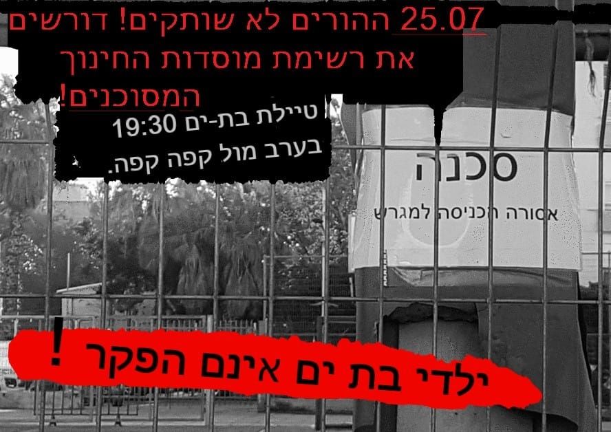 הפגנה בבת ים ! הפעילה החברתית איריס פרדלין קוראת להורים להצטרף להפגנה לגבי חשיפת מבנים מסוכנים במוסדות החינוך בבת ים, ביום חמישי 25.7 בטיילת בת ים ב19:30