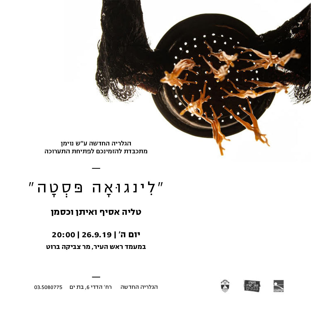 במסגרת התערוכה בגלריה החדשה יציג האומנים טליה אסיף ואיתן וכסמן את עבודותיהם, התערוכה הנקראת " לינגואה פסטה". הפתיחה תתקיים ביום חמישי הקרוב בשעה 20:00, הדדי 6 במעמד ראש העיר, צביקה ברוט.