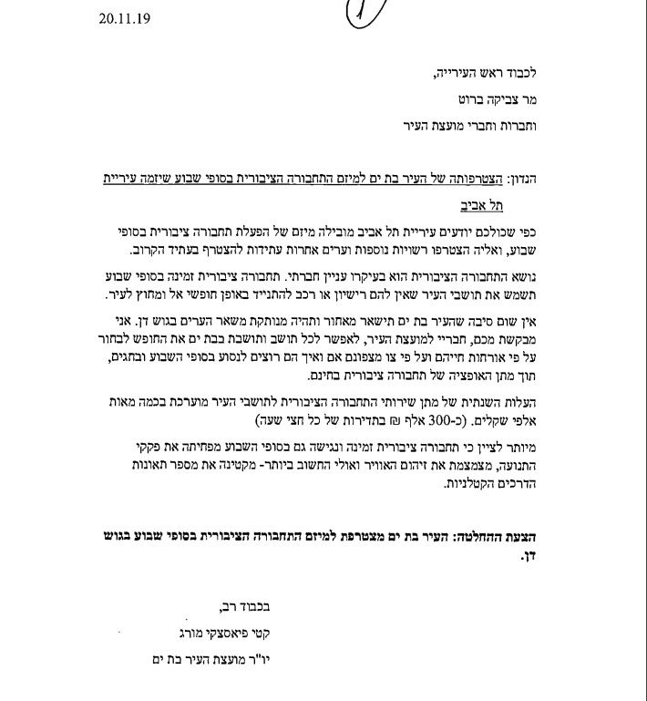 עיריית בת ים מבקשת להבהיר בנושא התחבורה הציבורית בשבת! הדיון בנושא הוסר ברוב מועצת העיר כיוון שעל פי הודעת ראש העיר הנושא יידון במסגרת עירונית ולא במסגרת פוליטית.