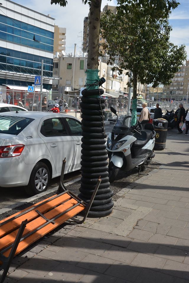 בתמונה: הגנה על עצים בשדרה מפני פגיעה אפשרית של ציוד וכלים הנדסיים.