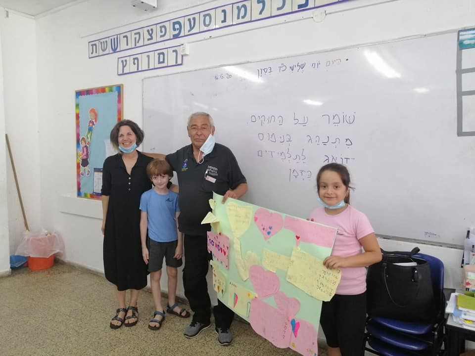 ילדי בית הספר, תלמידי כיתה א' יחד עם המורה ליעז הפתיעו את מאבטח בית הספר השומר עליהם יום יום ודואג לשלומם, עם ברכות חמות שהכינו לרגל זכייתו.