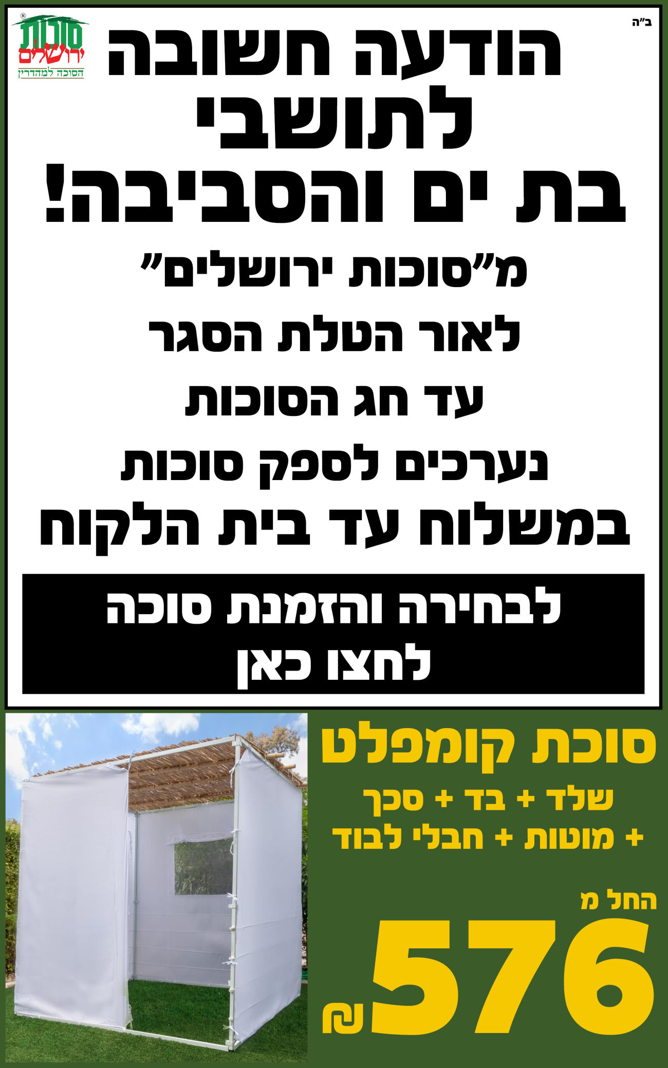 שימו לב, מתאריך 16.09.2020 ועד 20.09.2020 כולל ומתאריך 24.09.2020 ועד 11.10.2020 כולל , חל איסור על השלכת פסולת במרחב הציבורי מכל סוג: לרבות גזם, גרוטאות, ריהוט ישן מכשירי חשמל וכדומה.