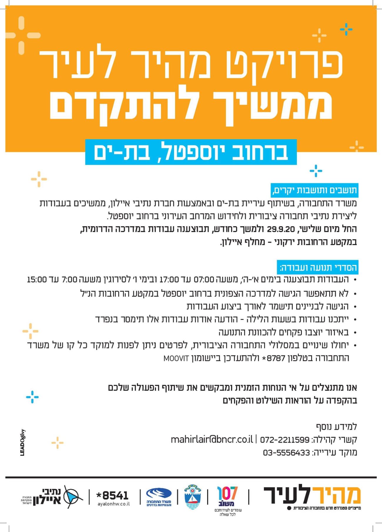 משרד התחבורה בשיתוף עיריית בת ים ובאמצעות חברת נתיבי איילון ממשיכים בעבודות ליצירת נתיבי תחבורה ציבורית וחידוש המרחב העירוני ברחוב יוספטל.