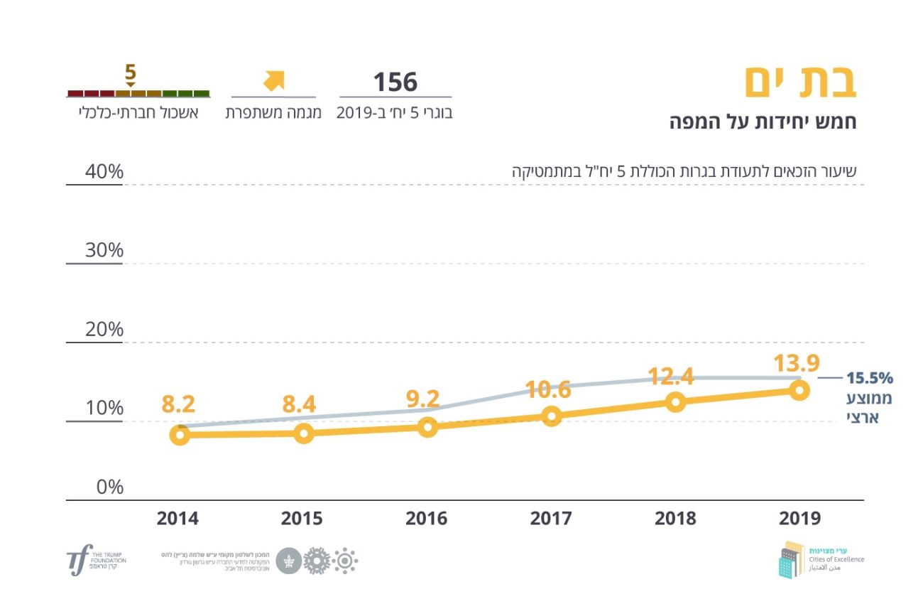 על פי הנתונים בת ים שייכת לקטגוריה רשויות משתפרות כאשר רשמה עלייה ביחס לשנת תשע"ח. יש לציין כי מאז שנת 2014 רושמת בת ים מדי שנה עלייה בזכאות ל5 י"ח במתמטיקה כאשר בשנת 2014 עמדה הזכאות בעיר על 8.2% ובשנת 2019 עלתה ל13.9%.
