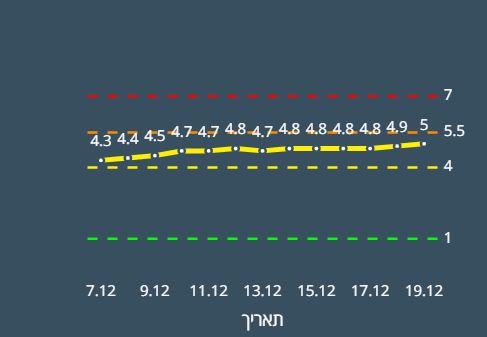 | תאריך | ציון יומי על פי תוכנית הרמזור | חולים חדשים לכל 10,000 איש | אחוז הבדיקות החיוביות | מספר החולים הפעילים |