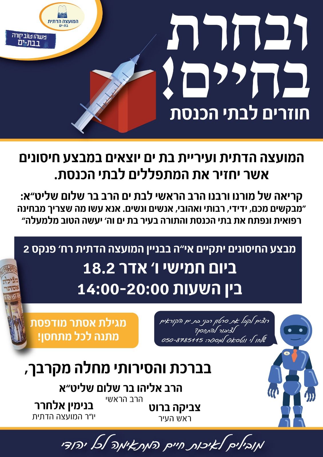 ובחרת בחיים-חוזרים לבית הכנסת'! מתחם חיסונים 'כשר' נפתח בבת-ים להעלאת אחוז החיסונים בתמיכה רחבה של רבני העיר. התחסנת? קבל מגילת אסתר מהודרת!