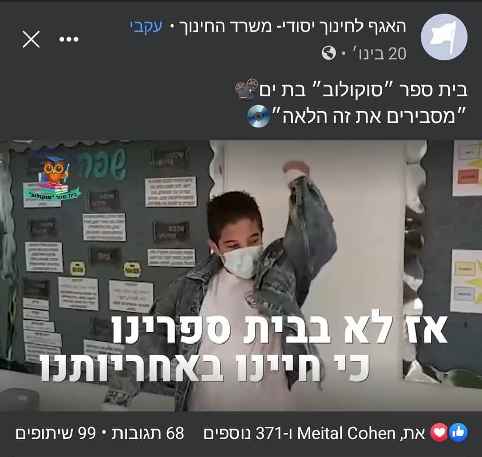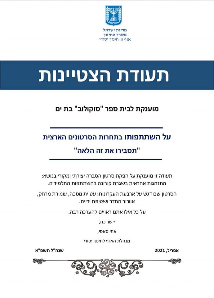 תלמידי בית ספר סוקולוב בבת ים זכו בתחרות סרטוני ההסברה " תסבירו את זה הלאה" של משרד החינוך לעידוד התנהגות אחראית בשגרת קורונה
