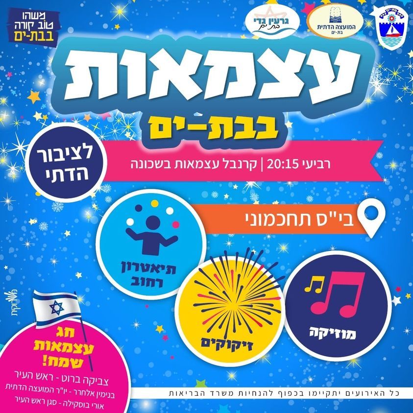 החגיגות ילוו במיצגי אווירה, פסלים חיים, לולייני קרקס, דוכני צבע ואיפור, דוכני משחק, מתחם ריקודי עם, מטחי זיקוקים (מהטיילת), תיאטרון רחוב ומוזיקה שתרים לכולנו חג עצמאות שמח, והכל בכפוף להנחיות משרד הבריאות.