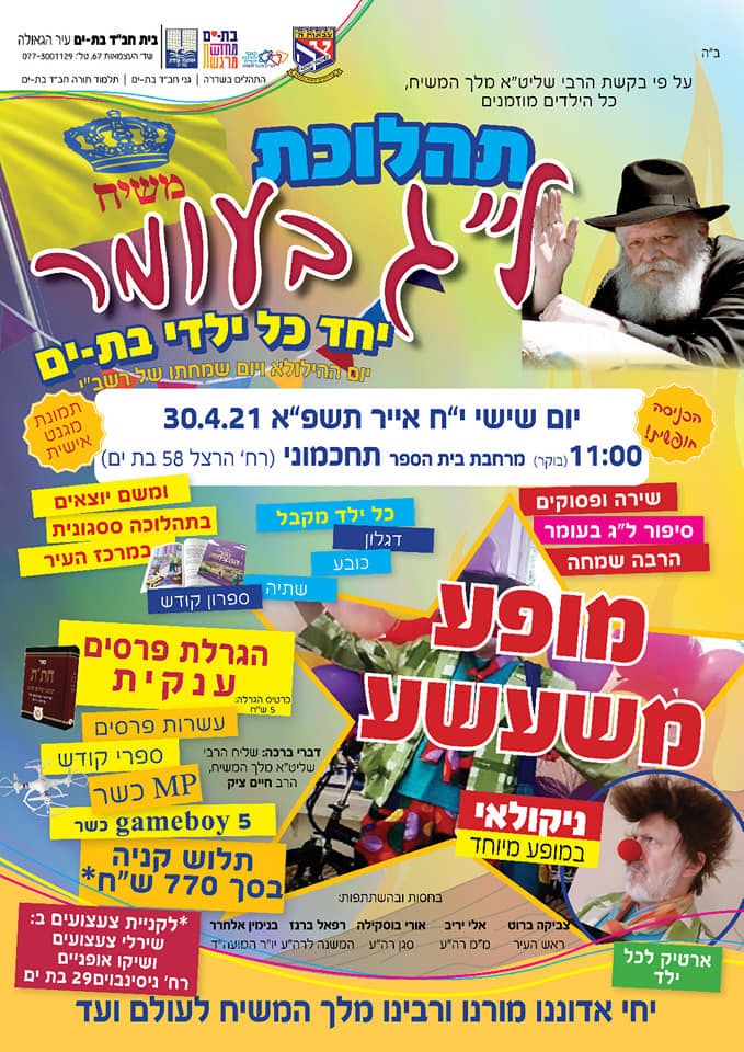 תהלוכות ל"ג בעומר בבת ים! מחר (שישי 30.4) יצאו שתי תהלוכות של בית חב"ד מספריית מנחם ובית ספר תחכמוני עם הפתעות לילדים, הגרלות פרסים ומופעים