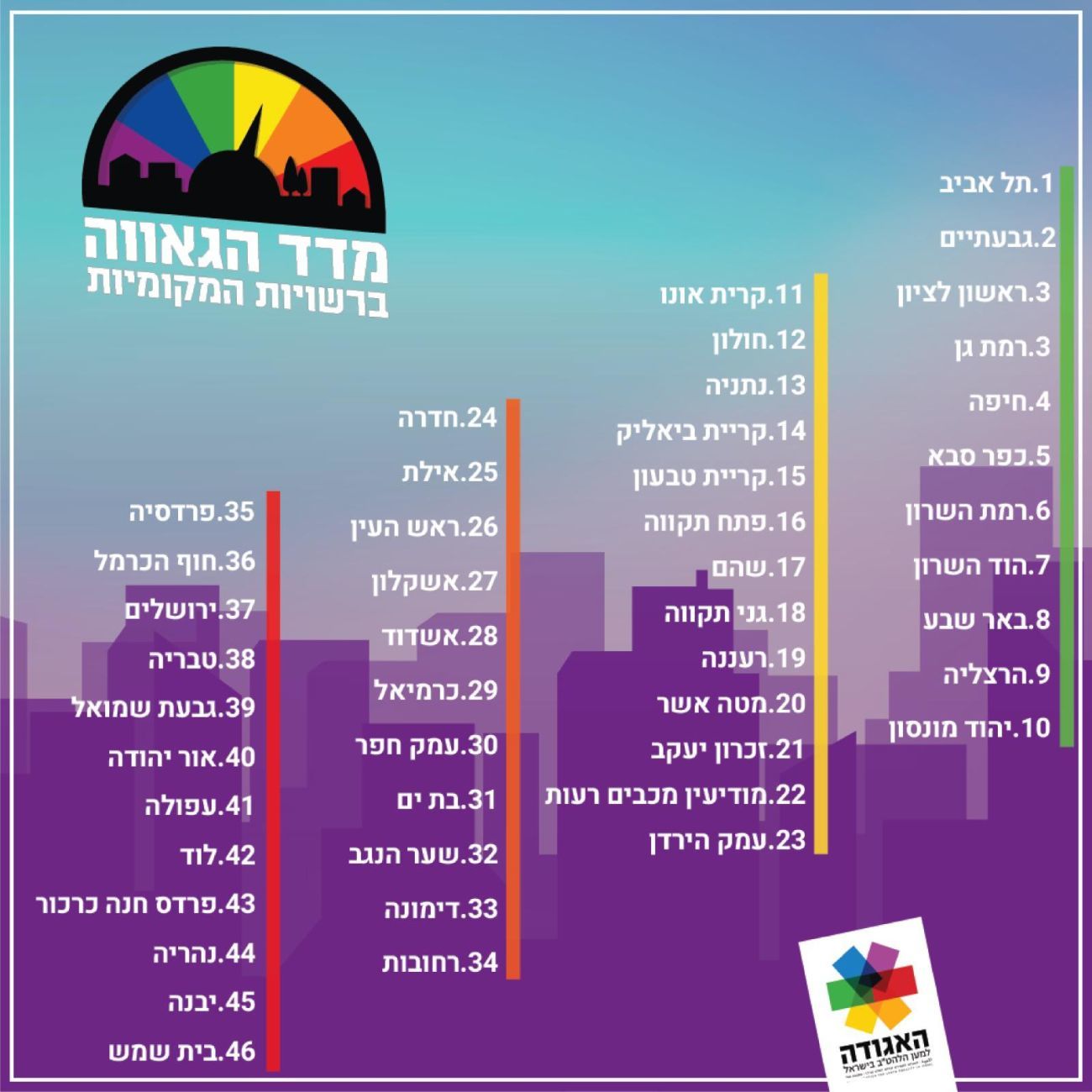לרגל פתיחת אירועי הגאווה ברחבי הארץ, האגודה למען הלהט"ב בישראל מפרסמת את מדד הגאווה ברשויות המקומיות שבוחן בכל שנה את יחסן של רשויות מקומיות נבחרות לקהילה הגאה, במטרה לשפר את איכות החיים ותחושת הביטחון ללהט״ב במרחב המקומי. הציונים ניתנים בקריטריונים הבאים: תרבות, חינוך, תשתית במבנה הארגוני, נראות במרחב הציבורי ורווחה, על פי הנתונים חמשת הערים שזכו במדד הגבוה הן: