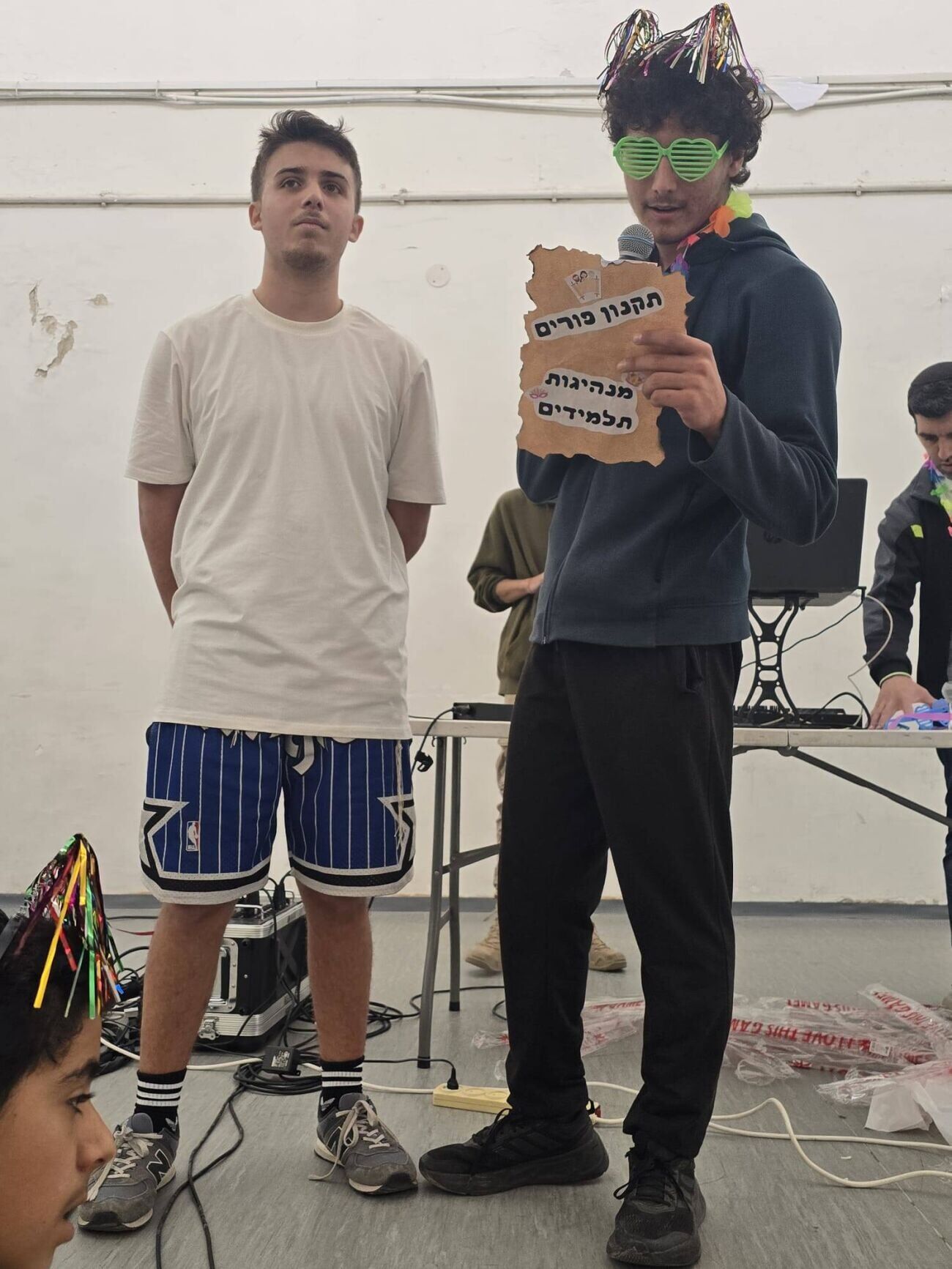 בנוסף לריקודים, התלמידים התקשטו באביזרים צבעוניים ומשקפיים היתוליים. כחלק מההכנות לחג הפורים, הציגו נציגי מנהיגות התלמידים בפני החברים את "תקנון פורים" הבית-ספרי, כפי שנראה בתמונות מהאירוע.