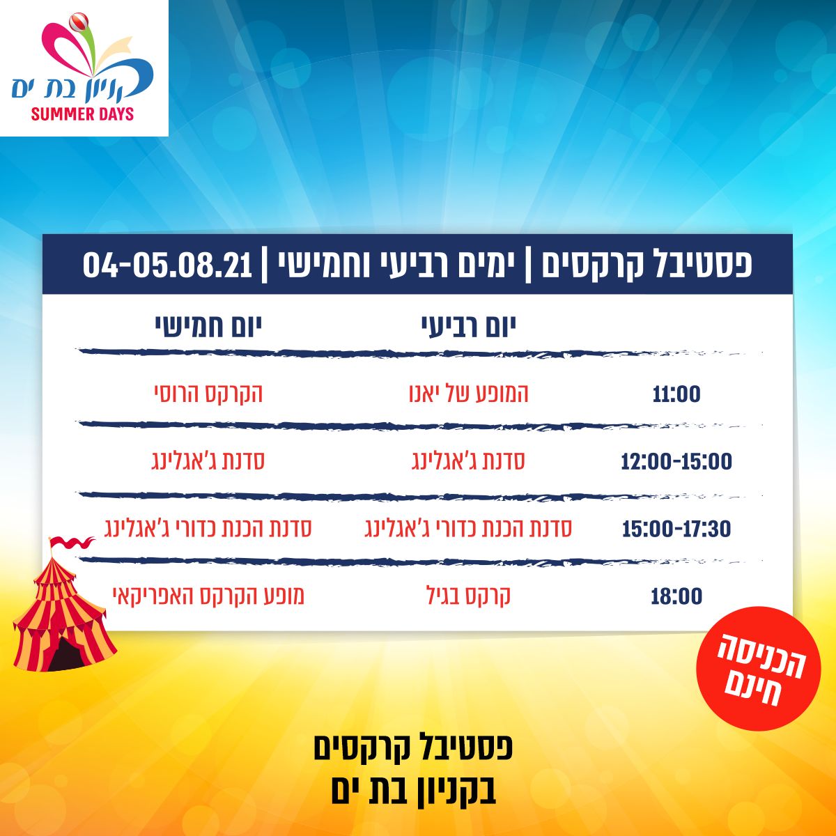 יום רביעי וחמישי, 4-5.8 החל מהשעה 11:00