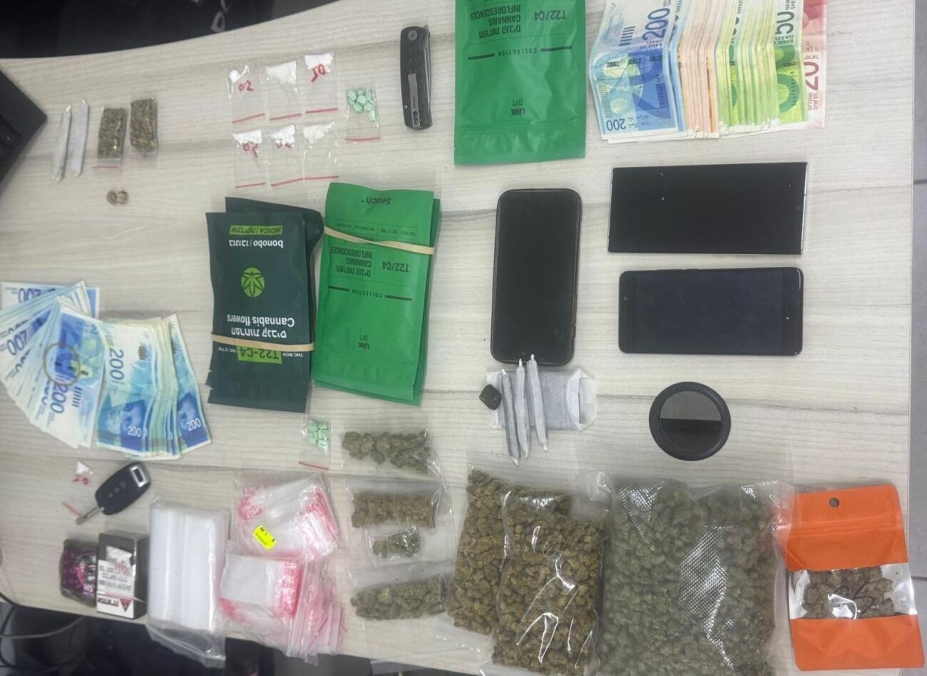 - חומר החשוד כסם מסוג קנאביס במשקל של 479 גרם ברוטו.