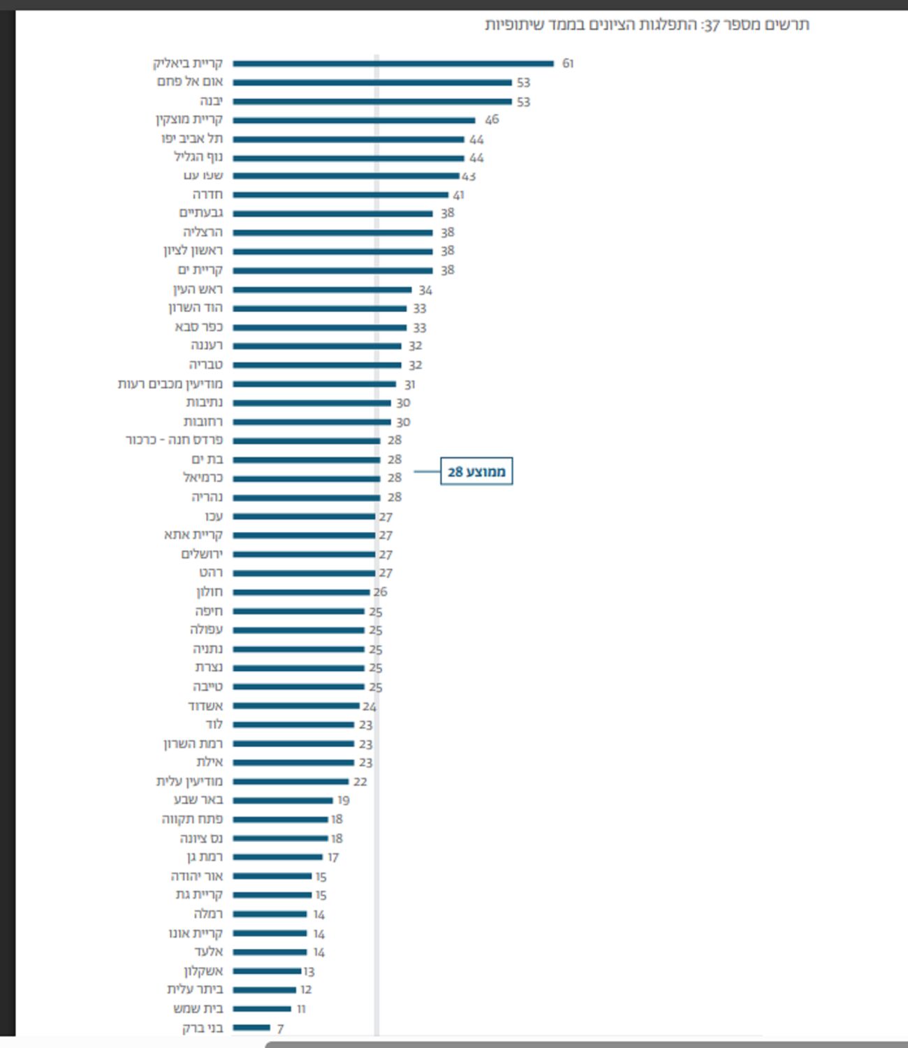 מדד שיתופיות - שיתופיות מתייחסת למידה שבה הרשות משתפת את הציבור בקביעת המדיניות ובקבלת ההחלטות. בת ים קבלה ציון ממוצע של 28