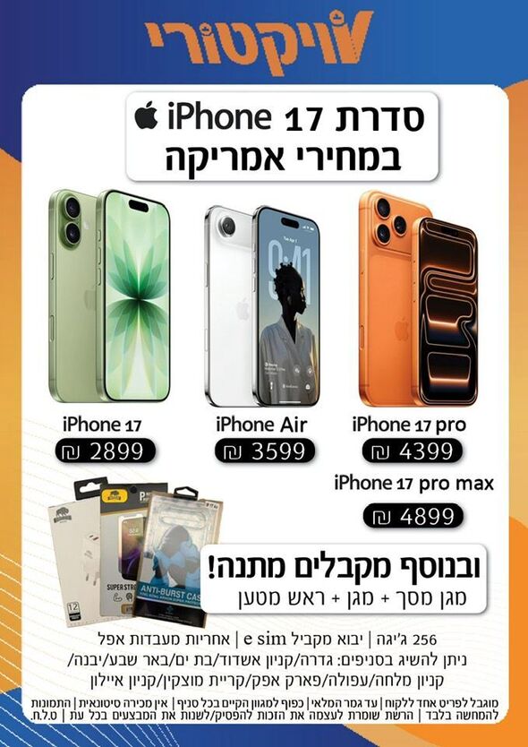 מדובר על דגמי איייפון 17, פרו, פרו מקס שיעלו בין 2,899 ל4,899 ש"ח שיימכרו במספר סניפים בודדים בהם סניף ויקטורי בבת ים, יבנה, קניון איילון, גדרה, קניון אשדוד, קריית מוצקין, קניון מלחה ובאר שבע.