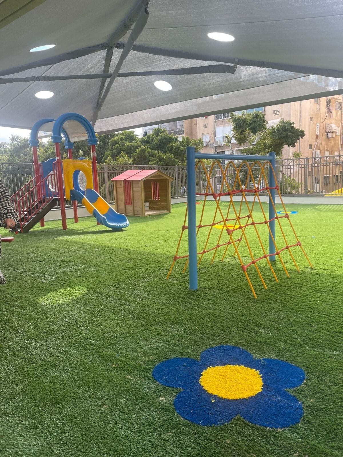 בכל חלקי החצר יותקנו הצללות, ברצפה יודבק דשא סינטטי לריכוך נפילתם של הקטנים.