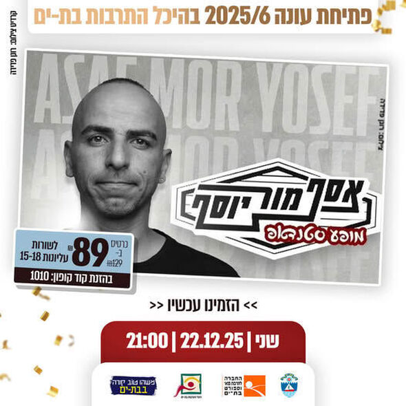 הסטנדאפיסט אסף מור יוסף מגיע להופעה בבת ים. מור יוסף, המוכר כיוצר שנון, מקורי ומבריק, מציג מופע בידור חדש המאופיין בקצב מסחרר ושימוש במימיקות מגוונות.