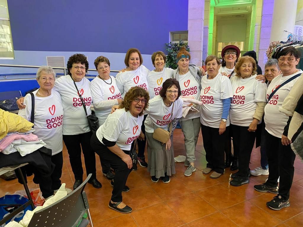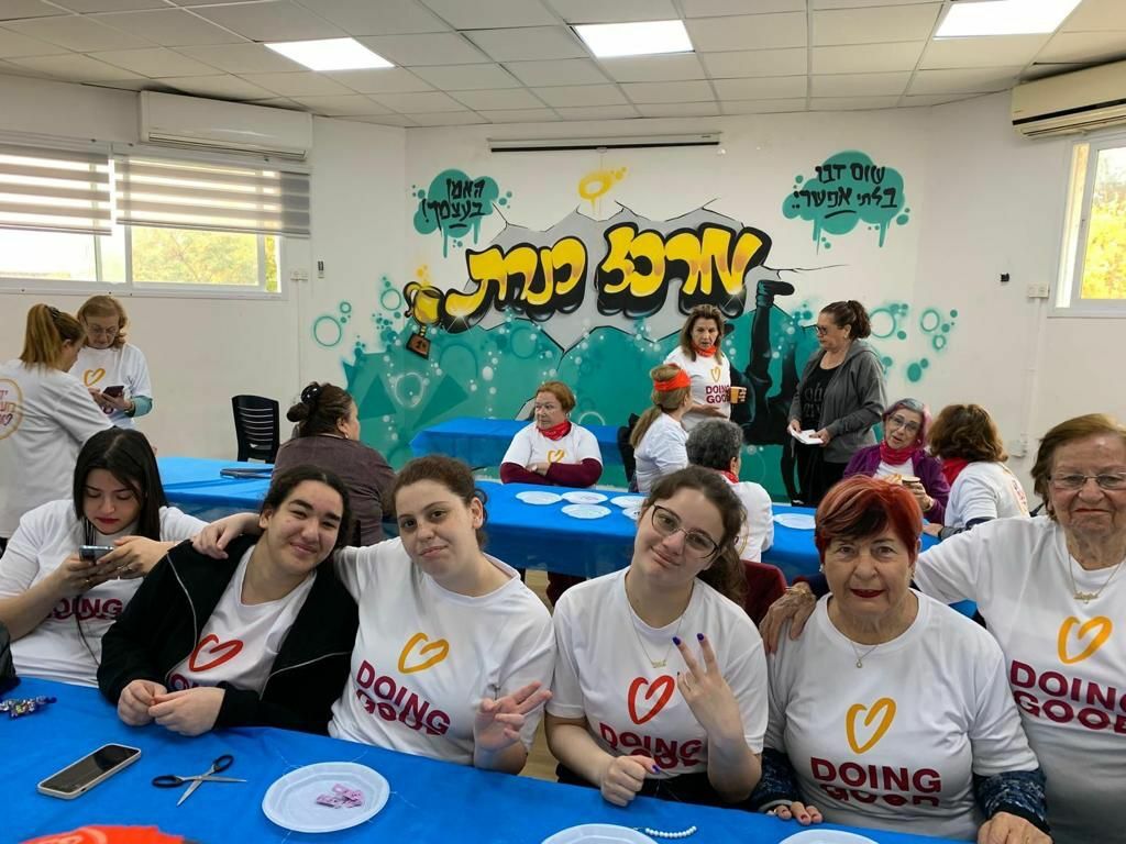 גמלאיות מרכז קהילתי עופר סורגות צעיפים שיחולקו יחד עם כובעים וסרטים לשיער במחלקה האונקולוגית בוולפסון.