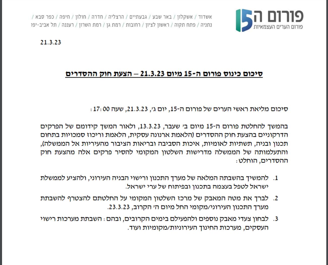 סיכום ישיבת פורום ה15 שהתקיימה אמש (21.3) בה הודיע הפורום על הצטרפות כלל הרשויות למחאה.