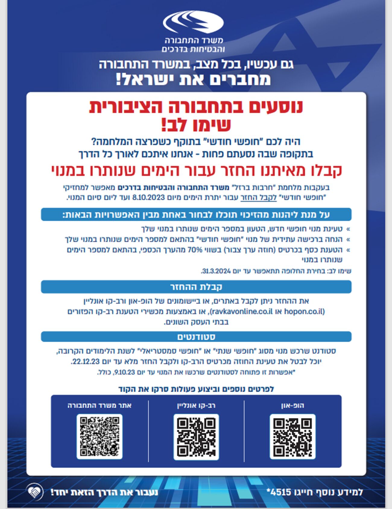 משרד התחבורה הודיע כי נוסעי התחבורה הציבורית שהחזיקו מנוי חופשי חודשי עם פרוץ המלחמה יוכלו לקבל החזר עבור יתרת הימים שנותרו להם במינוי