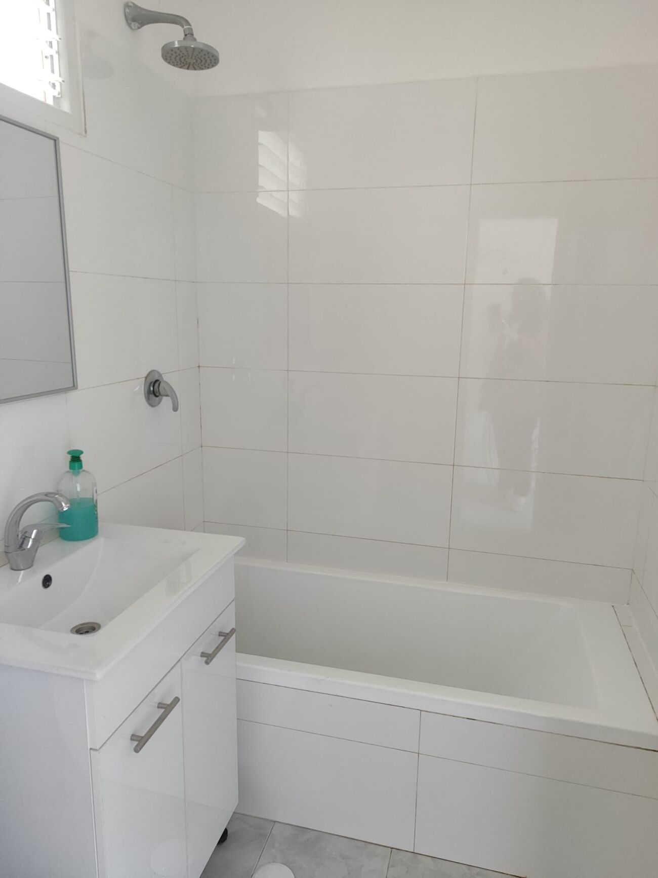שני שירותים ואמבטיה, חדר שירות מרווח עם ארון לאחסון ומתלה מוסתר גדול לכביסה.