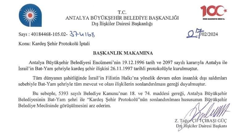עיריית בת-ים דיווחה כי העיר אנטליה בטורקיה הודיעה על ביטול הסכם הערים התאומות עם בת-ים, בשל מה שהיא מכנה "הטבח בעזה". הסכם זה נחתם בשנת 1997, והשבוע הודיעו מאנטליה כי בשל ההתקפות המתמשכות על העם הפלסטיני מצד ישראל, יש צורך להפסיק את כל הקשרים עם בת-ים.