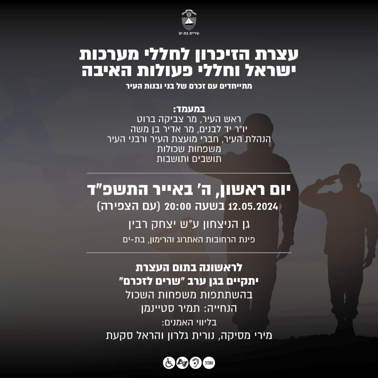 עיריית בת-ים מכריזה על קיום אירוע "שרים לזכרם" לראשונה בתום העצרת המרכזית לזכר חללי צבא ההגנה לישראל ונפגעי פעולות האיבה, שיתקיים בגן הניצחון ע"ש יצחק רבין. האירוע יתקיים בהנחיית כתב חדשות 12 תמיר סטיינמן ובהשתתפות הזמרים מירי מסיקה, נורית גלרון והראל סקעת.