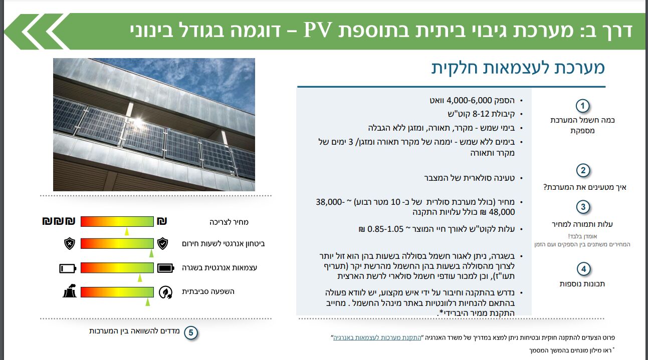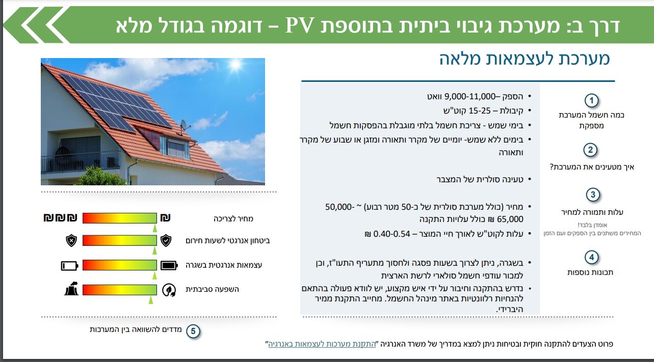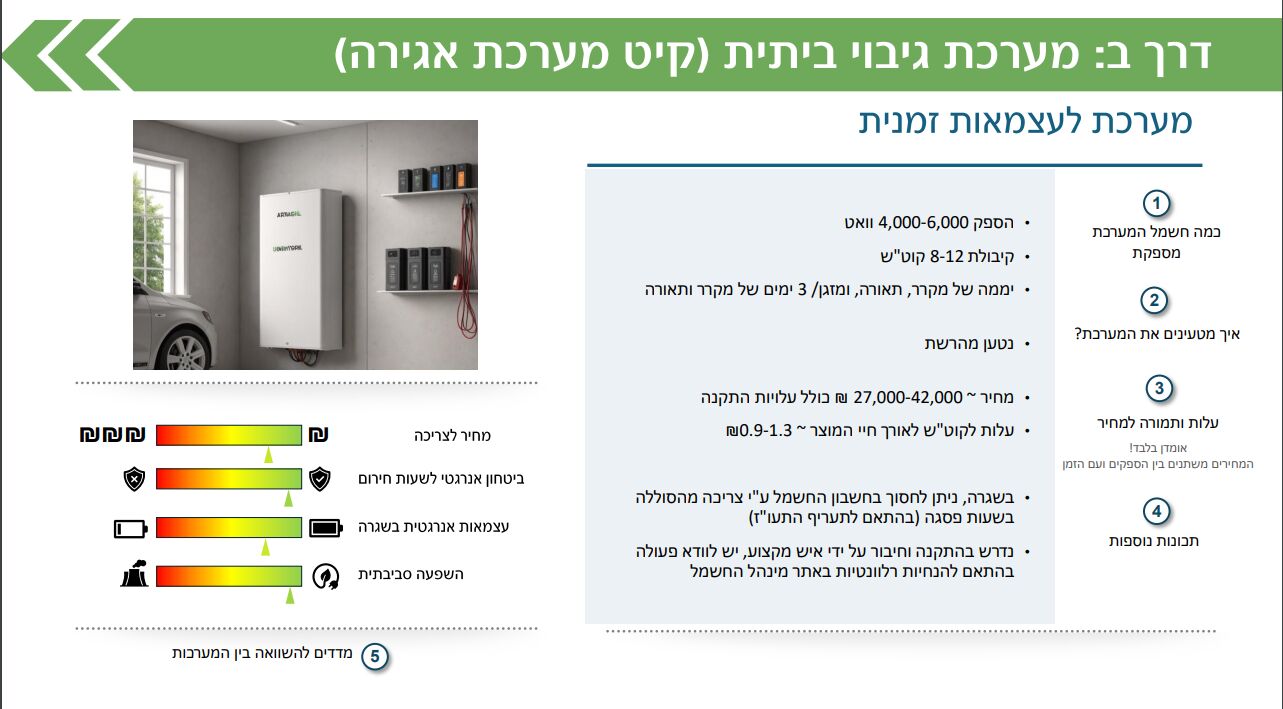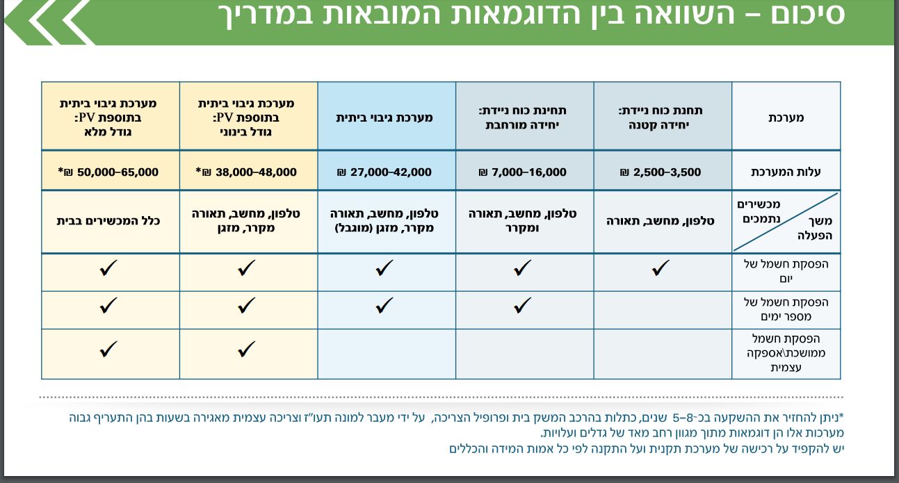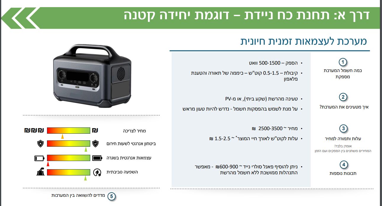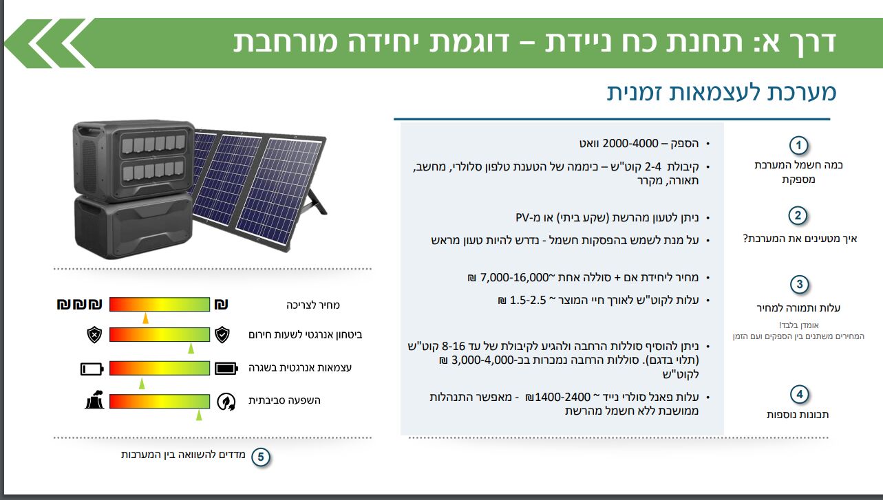 המדריך של המשרד להגנת הסביבה סוקר את כלל קשת המוצרים הזמינים למשקי בית, החל ממערכות בעלות של אלפים שקלים בודדים המסוגלות לספק צורכי חירום בסיסיים למשך כיממה, ומערכות גדולות הכוללות פאנלים סולאריים המאפשרים עצמאות אנרגטית מלאה לזמן בלתי מוגבל, ואף מאפשרות הכנסה והחזר השקעה לאורך זמן בעת שגרה.