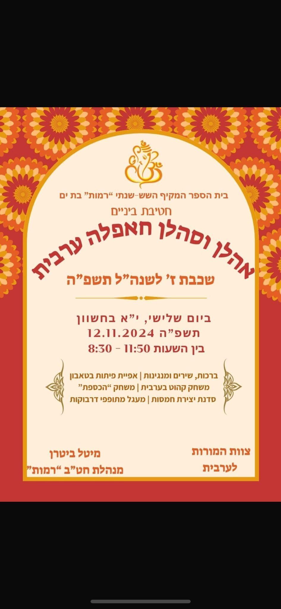 האירוע זכה להצלחה רבה, והתמונות מהאירוע מדברות בעד עצמן. תודה מיוחדת ניתנה לצוות המורות לערבית על תרומתן להצלחת היום.