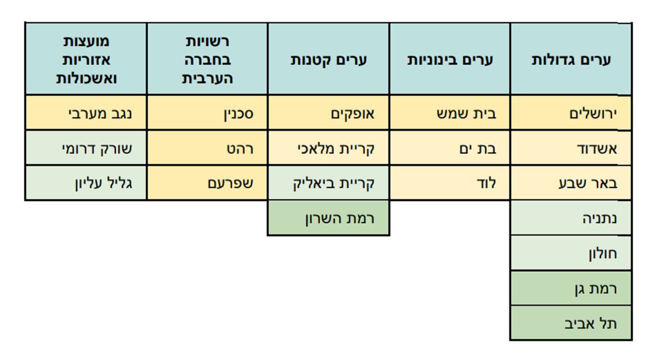הרשויות שבהן הנגישות החברתית היא הנמוכה ביותר הן: בת ים 10%, באר שבע 11, חולון 11%, אשדוד 14% ונתניה 14%