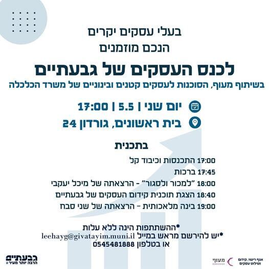 עיריית גבעתיים מארגנת כנס עסקים לבעלי ובעלות עסקים בעיר , שני 5/5 - הכניסה ללא עלות בהרשמה מראש