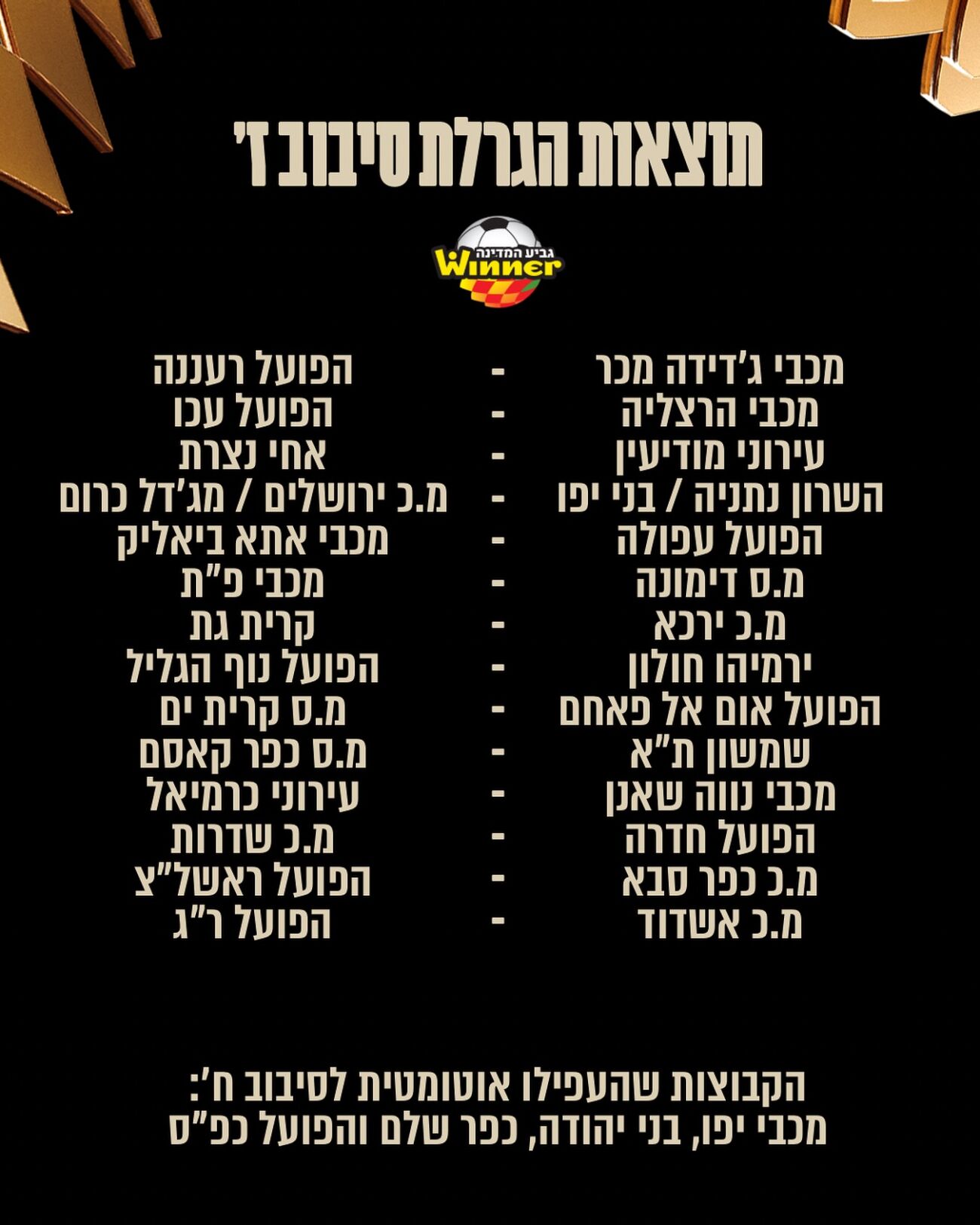 מכבי יפו, בני יהודה, כפרשלם והפועל כפר סבא עלו אוטומטית לסיבוב ח