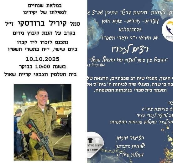 לזכרו: תיכון שמעון בן צבי בגבעתיים יקיים ביום חמישי 16/10 אירוע "רצים לזכרו" של בוגר בית הספר, קיריל ברודסקי ז"ל, אשר נפל בקרב על הגנת קיבוץ נירים