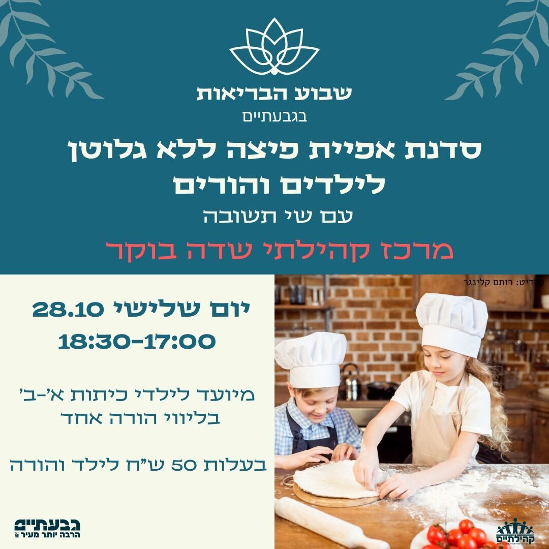 שבוע קידום הבריאות בגבעתיים: מרכז קהילתי שדה בוקר יקיים סדנת אפיית פיצה ללא גלוטן וסדנת יוגה להורים וילדים בשלישי 28.10 ובחמישי 30.10