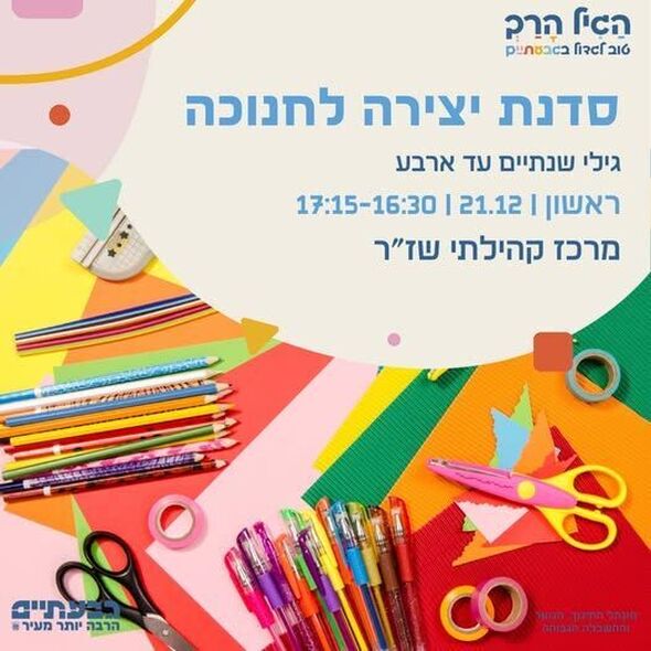 סדנת יצירה לחנוכה להורים וילדים תתקיים במרכז קהילתי שז"ר בגבעתיים ביום ראשון 21.12