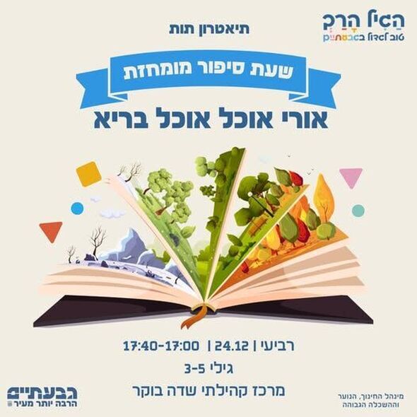 ביום רביעי, ה-24 בדצמבר, תתקיים במרכז קהילתי שדה בוקר בגבעתיים פעילות תיאטרון סיפור לילדים בשם "אורי אוכל אוכל בריא", בשיתוף תיאטרון תות.