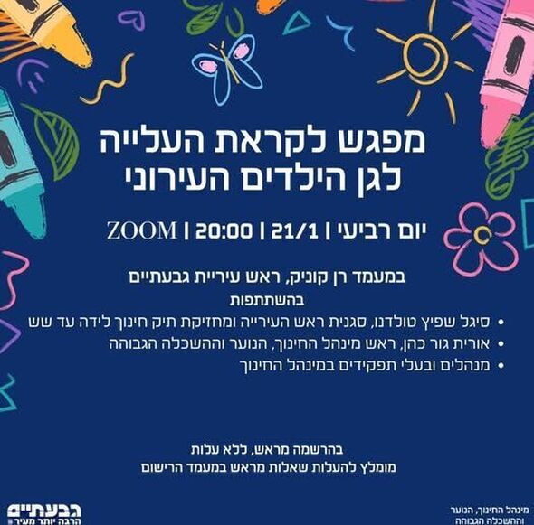 עיריית גבעתיים הודיעה על קיום מפגש מיוחד המיועד להורים שילדיהם עתידים להיכנס לגנים העירוניים. הכניסה לגן הילדים העירוני מהווה צעד משמעותי שעשוי להיות מלווה בחששות ובשאלות לגבי אופן הסתגלות הילדים, השינויים הצפויים וסדר היום בגן.