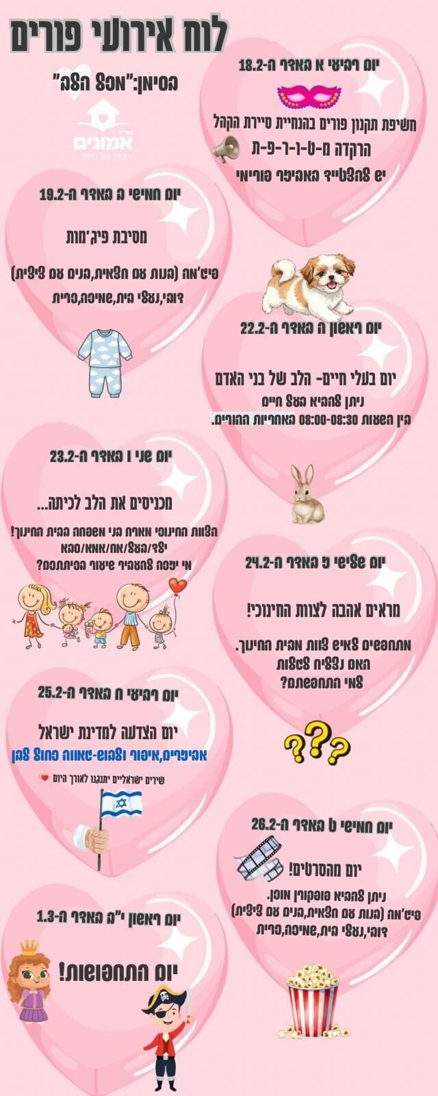 - יום חמישי (19.2): מסיבת פיג'מות מחולקת לפי שכבות גיל.