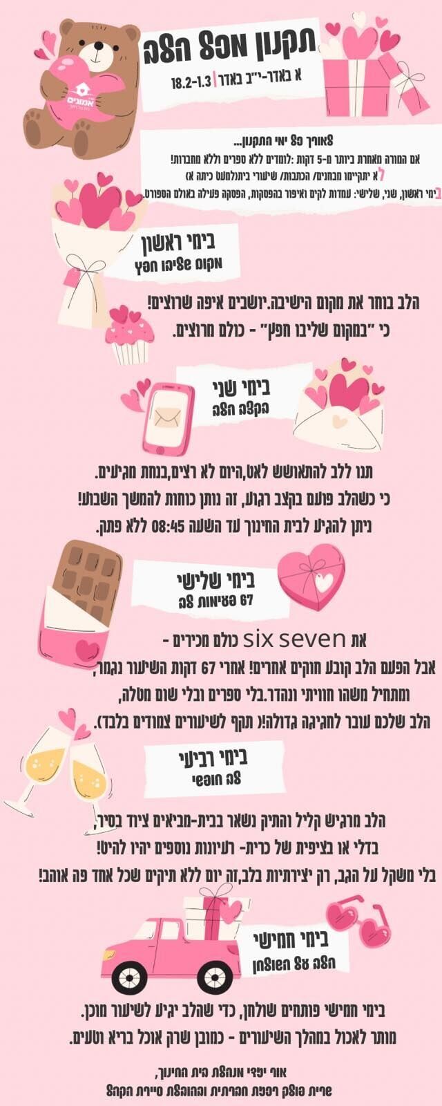 - יום שלישי (24.2): יום הוקרה ואהבה לצוות החינוכי.