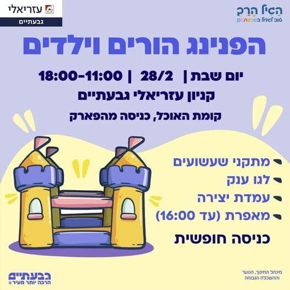 בשבת הקרובה, ה-28 בפברואר, יתקיים הפנינג חווייתי המיועד להורים וילדים בקניון עזריאלי גבעתיים. האירוע מציע מגוון פעילויות ואטרקציות לכל המשפחה ומזמין את הציבור ליהנות מבילוי משותף באווירה פורימית וחגיגית במהלך סוף השבוע.