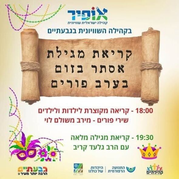 בשל הגבלות ההתקהלות: קהילת אופיר בגבעתיים תקיים הערב (שני, 2.3) קריאת מגילה כפולה בזום לילדים ולמבוגרים