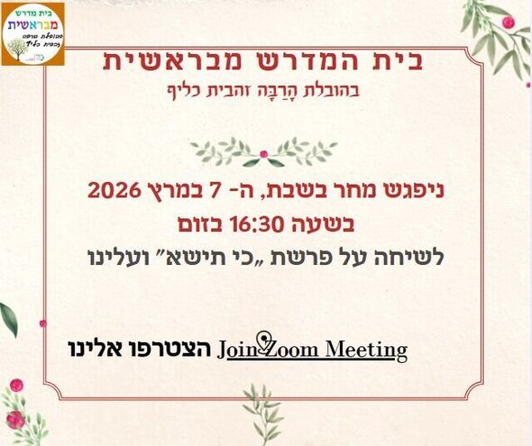 בשבת ה-7 במרץ 2026: מפגש פתוח בזום של בית המדרש 'מבראשית' עם הרבה זהבית כליף על פרשת 'כי תישא'. בשעה 16:30
