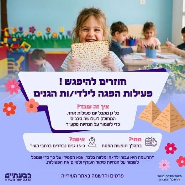 לאחר תקופה מאתגרת של למעלה משלושה שבועות, עיריית גבעתיים הודיעה כי היא מזמינה את ילדי הגנים בעיר לפעילות הפגה מיוחדת לכבוד חג הפסח, במטרה לאפשר לילדים ולהורים רגעי מפגש, משחק וחזרה מסוימת לשגרה.