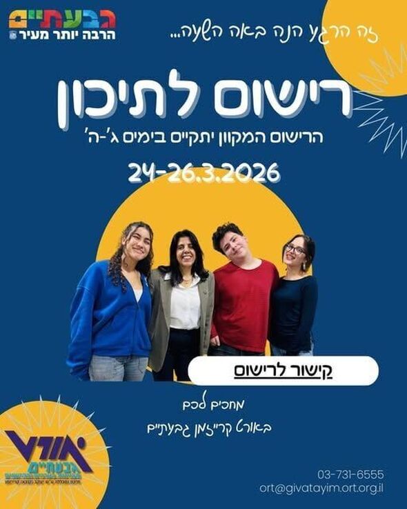החל הרישום המקוון לתיכון אורט קרייזמן בגבעתיים לשנת הלימודים תשפ"ז בין התאריכים 24-26.3