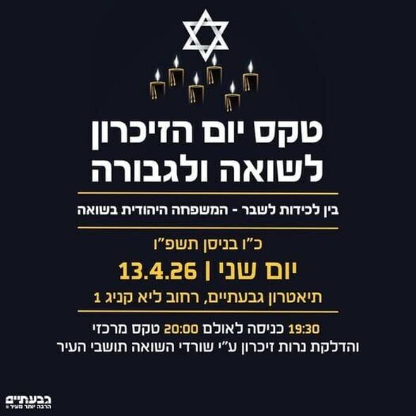 עיריית גבעתיים תקיים השנה את הטקס העירוני המרכזי לציון יום הזיכרון לשואה ולגבורה בתיאטרון גבעתיים. האירוע ייערך ביום שני, 13 באפריל 2026 (כ"ו בניסן תשפ"ו).